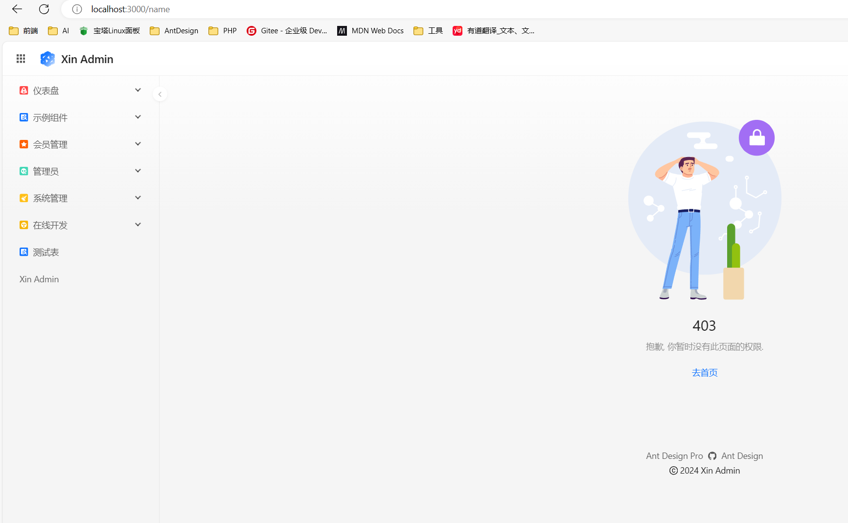 当你访问进去的时候你会发现页面中出现没有权限的页面,下面我们来学习如何增加当前页面的权限