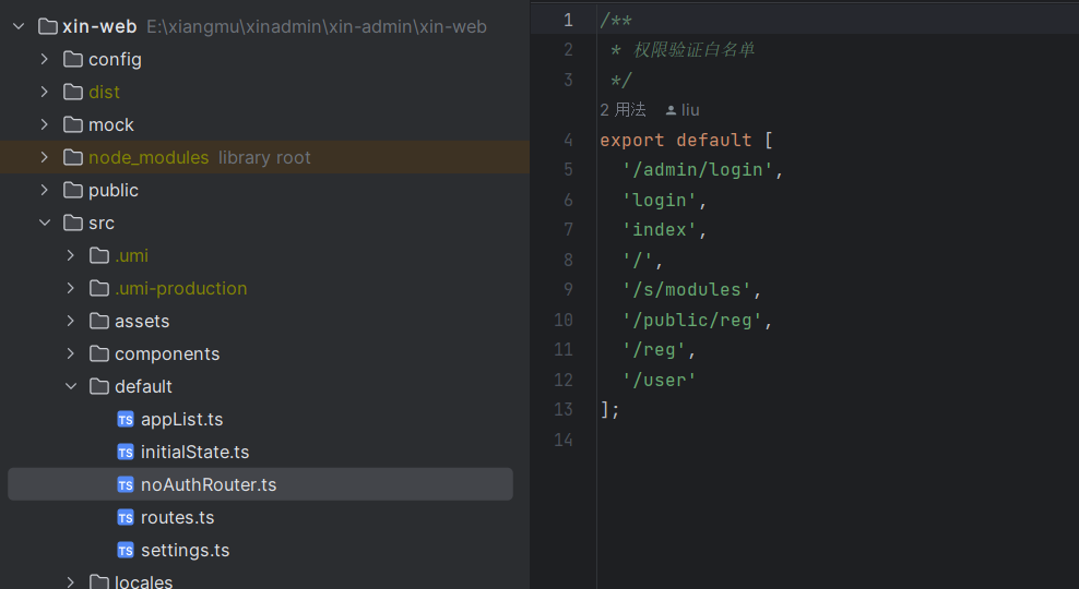 在图片文件的数组中添加 /name 这样就把这个路径排除在路由权限之外,适用于官网首页、登录页等不需要用户鉴权的页面,添加进去后,你在刷新页面,就可以访问到刚才新建的页面中