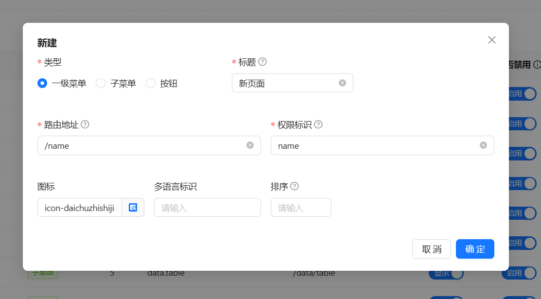 页面的权限可以通过后台来配置,以实现不同用户看到不同页面的目的,下面我们来添加 name 页面的权限